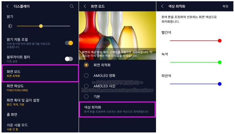 설정 > 디스플레이 > 화면모드 > 색상 최적화에서 수동으로 RGB 조정을 할수 있습니다.